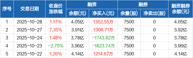 融资方面,当日融资买入6277.68万元,融资偿还4925.13万元,融资净买入1352.55万元。融券方面,融券卖出0股,融券偿还0股,融券余量7500股,融券余额12.3万元。融资融券余额合计4.05亿元。