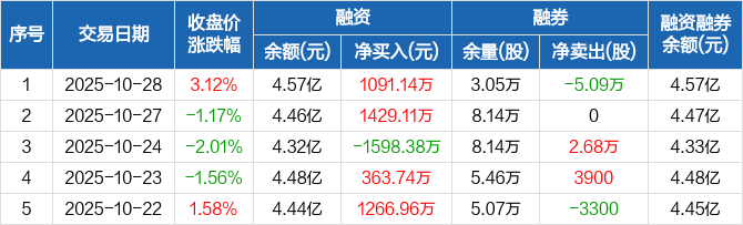 融资方面,当日融资买入5258.24万元,融资偿还4167.1万元,融资净买入1091.14万元。融券方面,融券卖出2700股,融券偿还5.36万股,融券余量3.05万股,融券余额21.17万元。融资融券余额合计4.57亿元。