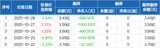 融资方面,当日融资买入1015.78万元,融资偿还1704.84万元,融资净偿还689.06万元,连续5日净偿还累计3291.12万元。融券方面,融券卖出0股,融券偿还0股,融券余量0股,融券余额0元。融资融券余额合计3.43亿元。