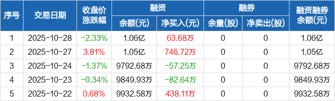 融资方面,当日融资买入452.09万元,融资偿还388.42万元,融资净买入63.68万元。融券方面,融券卖出0股,融券偿还0股,融券余量0股,融券余额0元。融资融券余额合计1.06亿元。