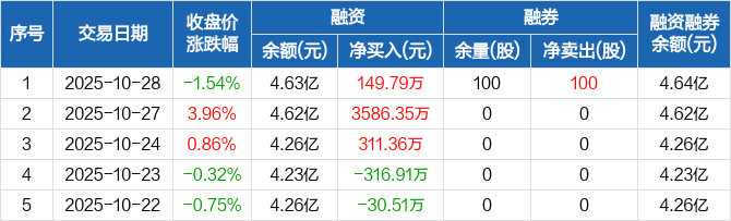 融资方面,当日融资买入3602.49万元,融资偿还3452.71万元,融资净买入149.79万元,连续3日净买入累计4047.49万元。融券方面,融券卖出100股,融券偿还0股,融券余量100股,融券余额957元。融资融券余额合计4.64亿元。