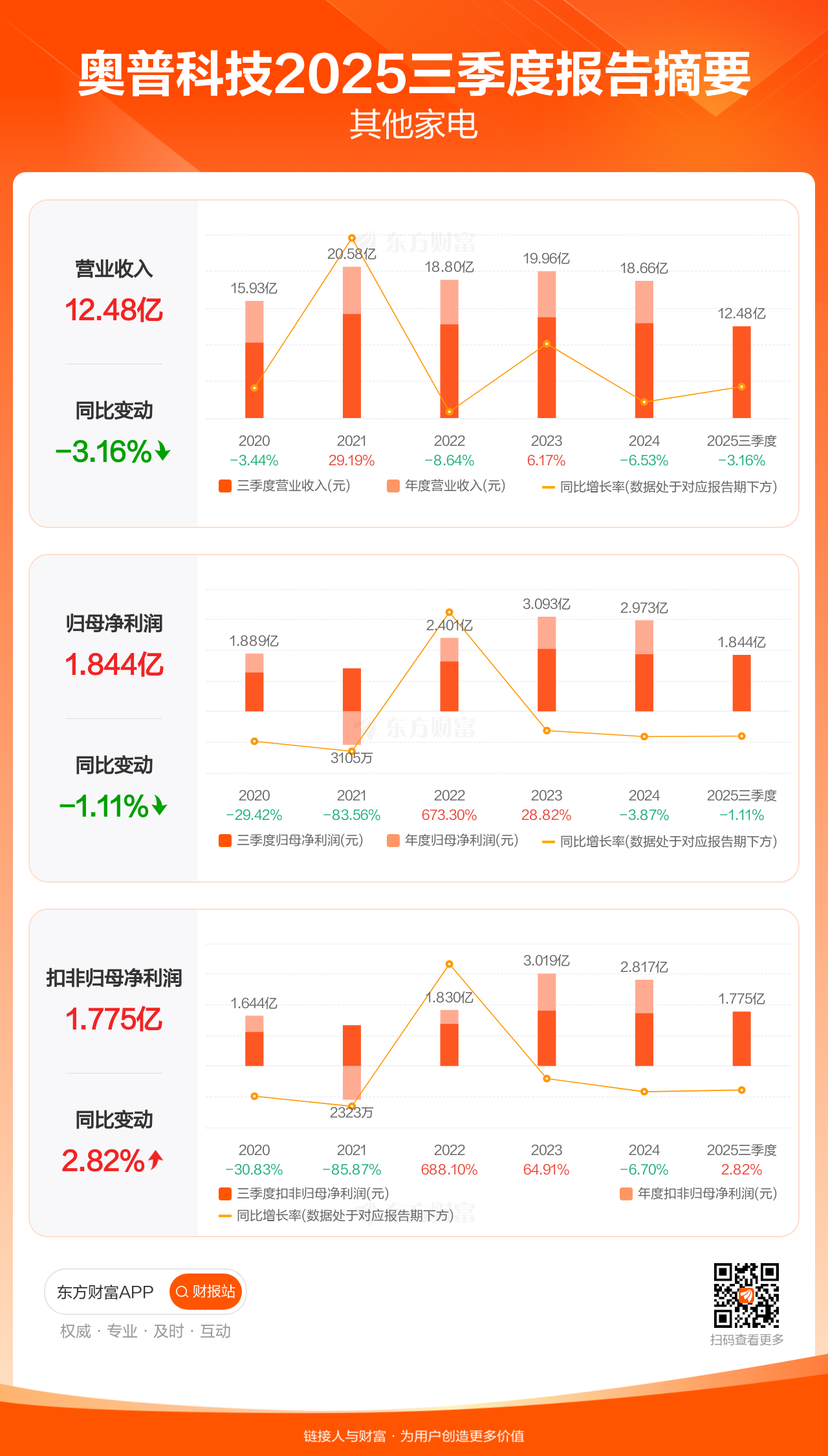 奥普科技10月28日发布2025年三季报显示,公司前三季实现营业收入12.48亿元,同比下滑3.16%;归母净利润1.84亿元,同比下滑1.11%;扣非归母净利润1.77亿元,同比增长2.82%。