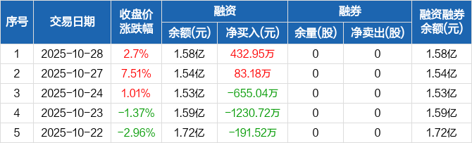 融资方面,当日融资买入2070.95万元,融资偿还1638万元,融资净买入432.95万元。融券方面,融券卖出0股,融券偿还0股,融券余量0股,融券余额0元。融资融券余额合计1.58亿元。