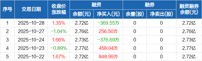 融资方面,当日融资买入1133.04万元,融资偿还1502.59万元,融资净偿还369.55万元。融券方面,融券卖出0股,融券偿还0股,融券余量0股,融券余额0元。融资融券余额合计2.72亿元。