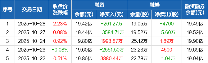 融资方面,当日融资买入1.64亿元,融资偿还1.67亿元,融资净偿还261.27万元。融券方面,融券卖出400股,融券偿还5100股,融券余量19.05万股,融券余额768.86万元。融资融券余额合计19.49亿元。