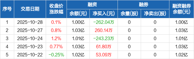肯特股份融资融券信息显示,2025年10月28日融资净偿还262.04万元;融资余额1亿元,较前一日下降2.54%。