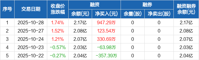 融资方面,当日融资买入2779.14万元,融资偿还1831.85万元,融资净买入947.29万元,连续3日净买入累计1401.52万元。融券方面,融券卖出0股,融券偿还0股,融券余量0股,融券余额0元。融资融券余额合计2.17亿元。