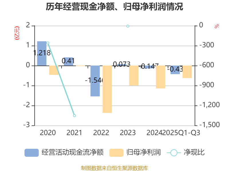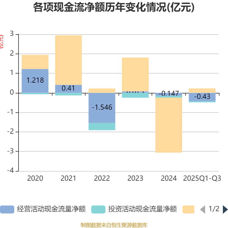2025年前三季度,公司经营活动现金流净额为-4299.4万元,同比增加343.13万元;筹资活动现金流净额2263.79万元,同比增加2.71亿元;投资活动现金流净额-572.03万元,上年同期为-749.69万元。