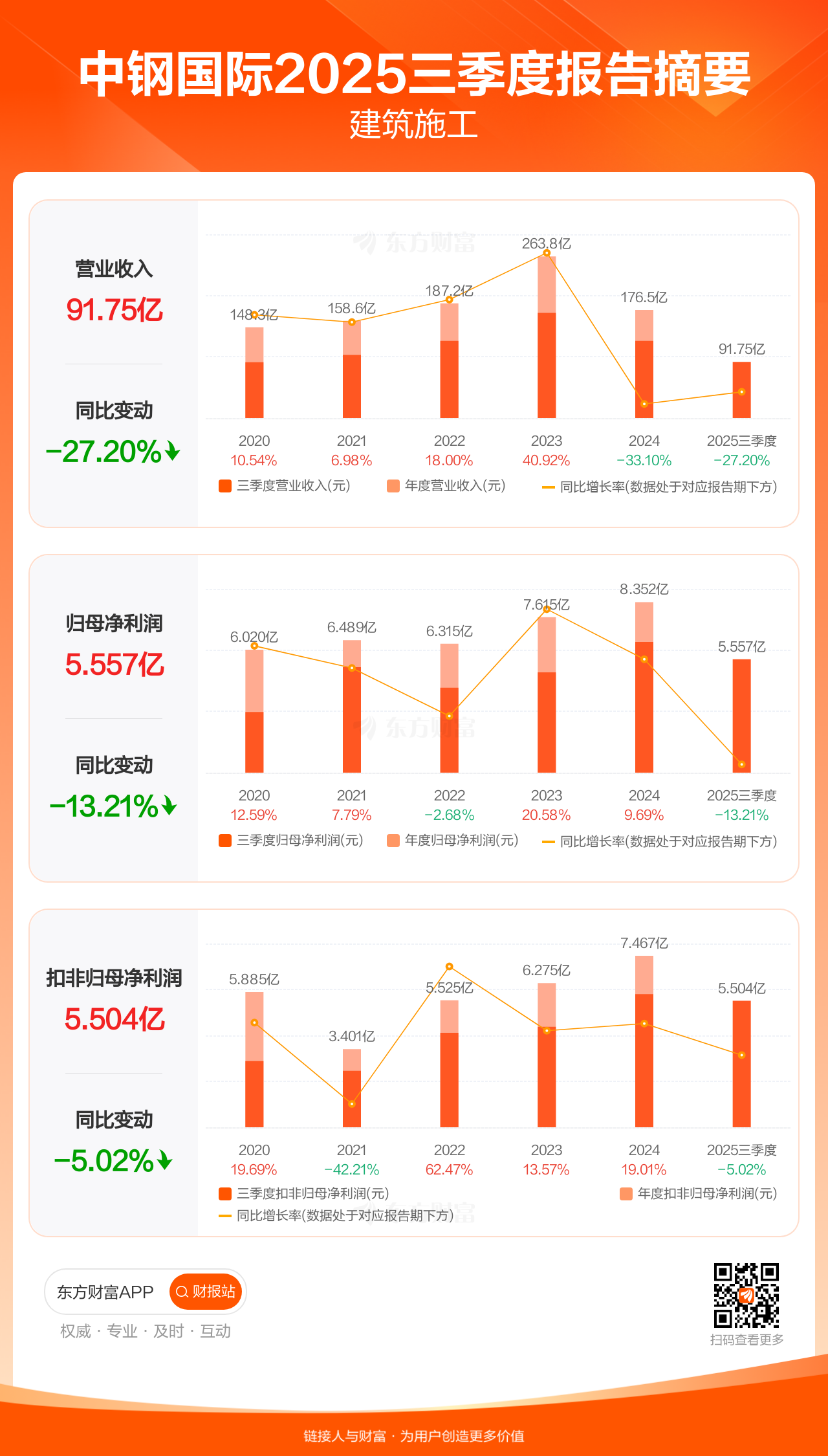 中钢国际10月30日发布2025年三季报显示,公司前三季实现营业收入91.75亿元,同比下滑27.20%;归母净利润5.56亿元,同比下滑13.21%;扣非归母净利润5.50亿元,同比下滑5.02%。