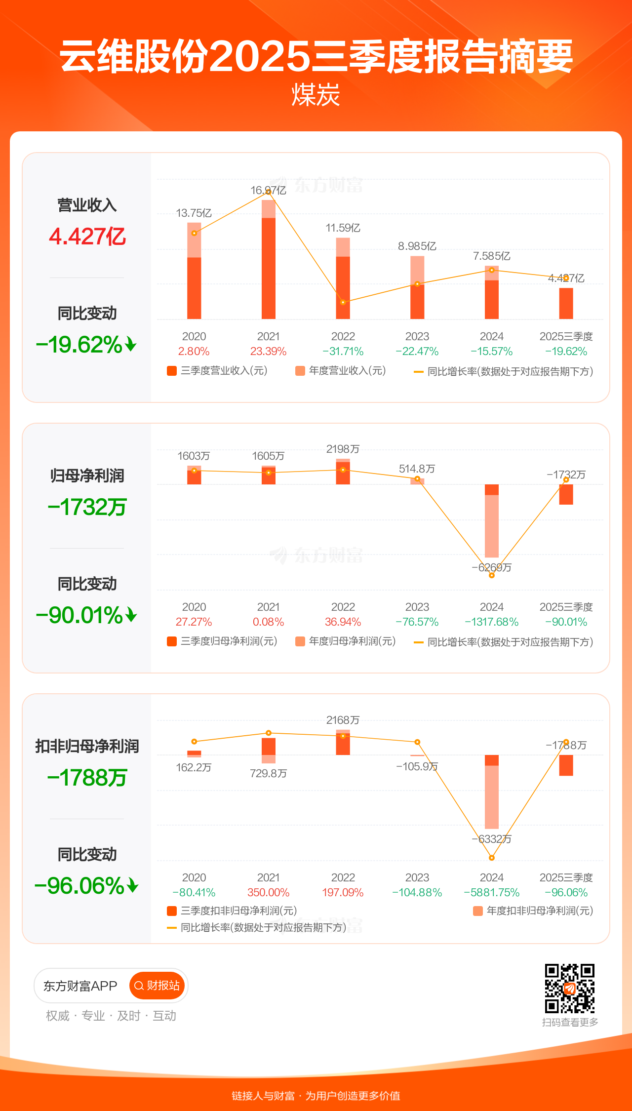 云维股份10月30日发布2025年三季报显示,公司前三季实现营业收入4.43亿元,同比下滑19.62%;归母净利润-1731.75万元;扣非归母净利润-1787.76万元。