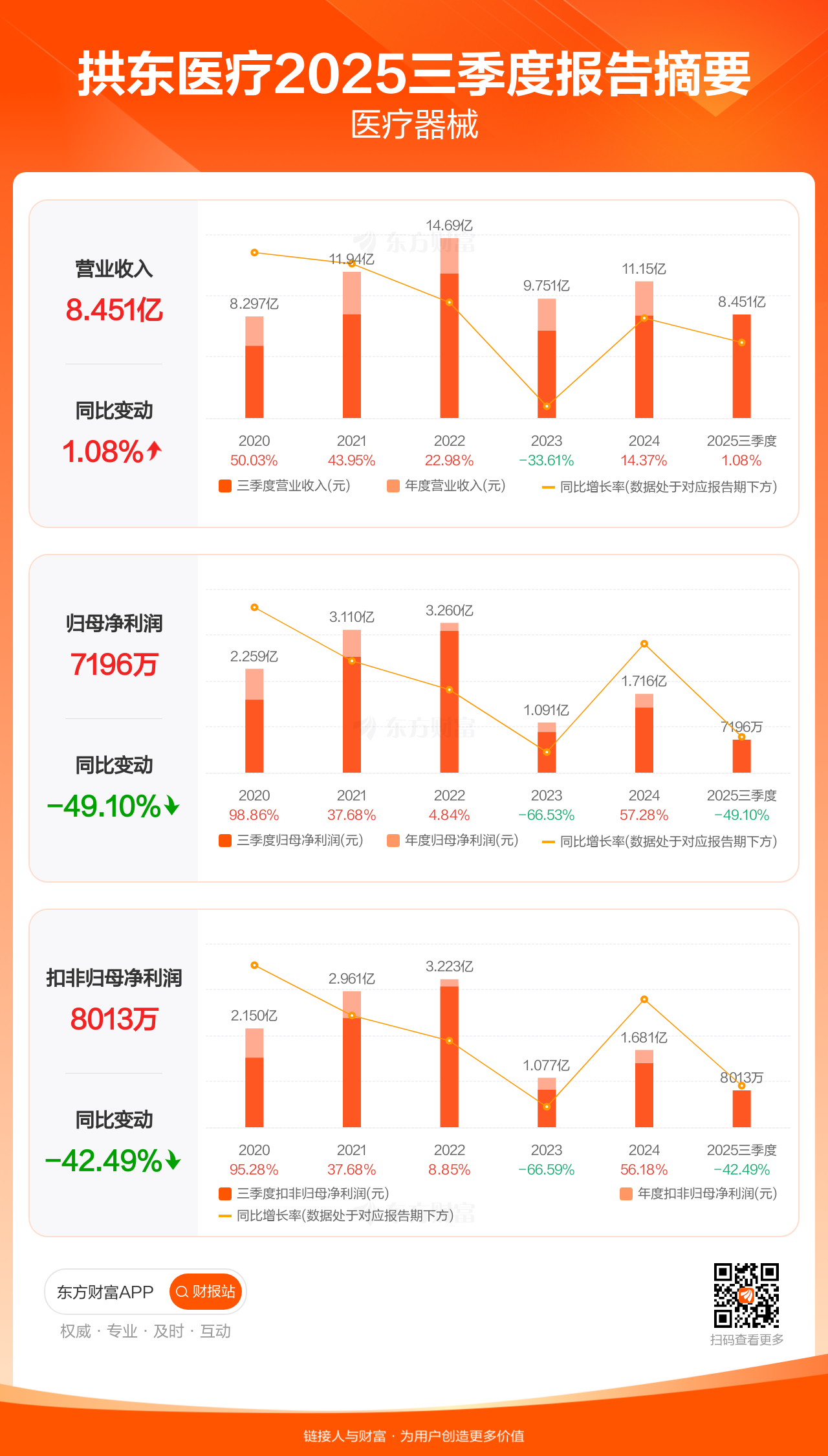 拱东医疗10月30日发布2025年三季报显示,公司前三季实现营业收入8.45亿元,同比增长1.08%;归母净利润7196.46万元,同比下滑49.10%;扣非归母净利润8012.68万元,同比下滑42.49%。