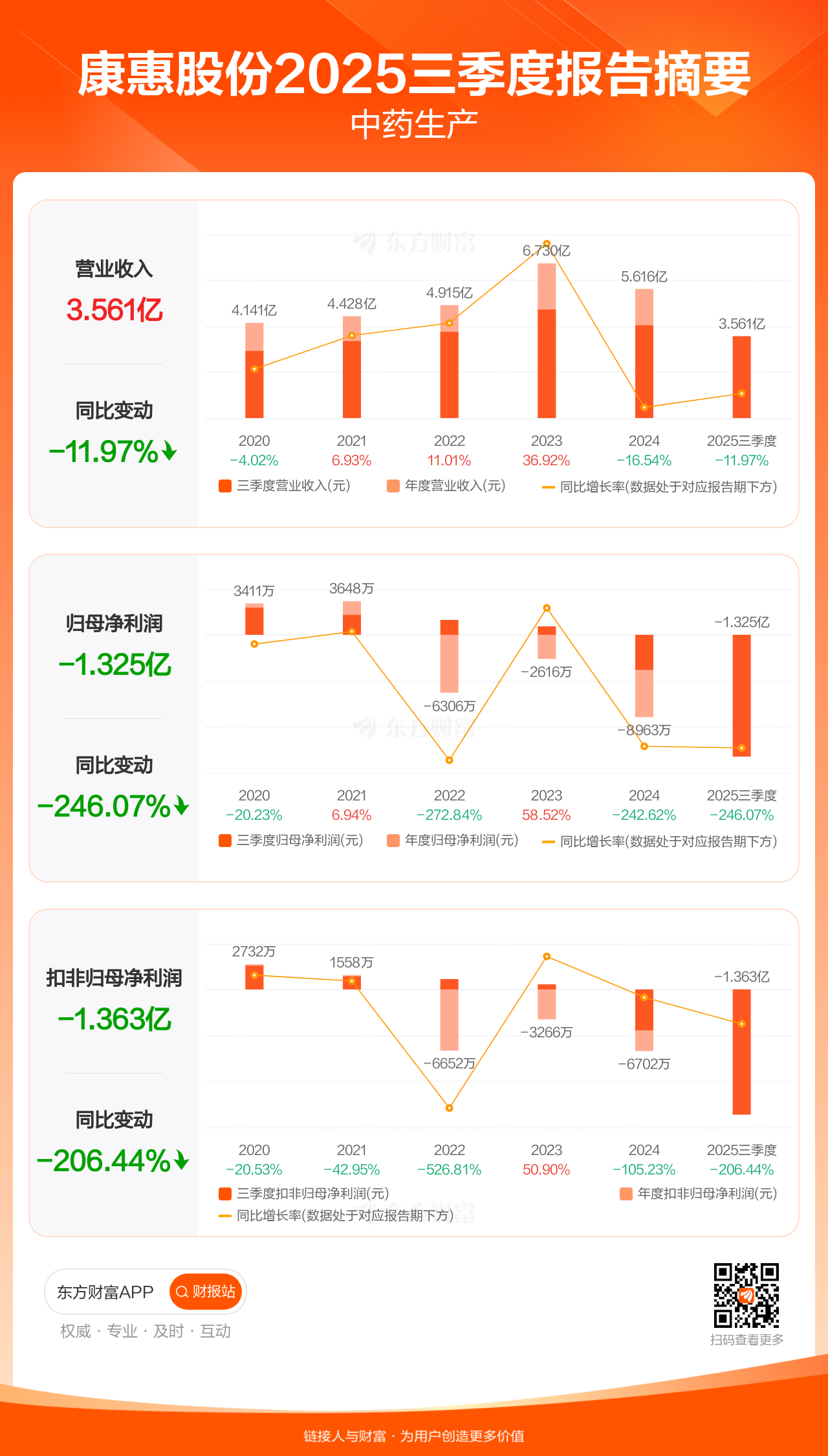 康惠股份10月30日发布2025年三季报显示,公司前三季实现营业收入3.56亿元,同比下滑11.97%;归母净利润-1.33亿元;扣非归母净利润-1.36亿元。
