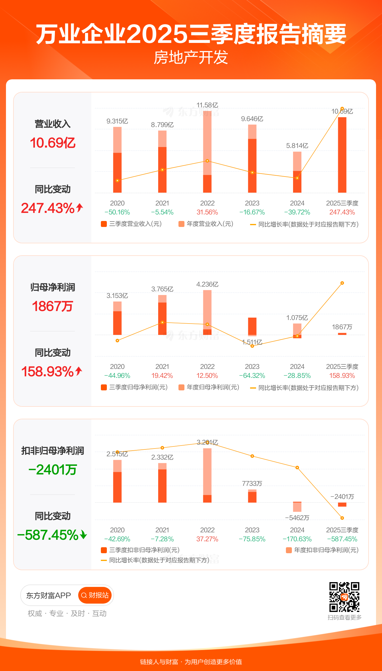 万业企业10月30日发布2025年三季报显示,公司前三季实现营业收入10.69亿元,同比增长247.43%;归母净利润1866.72万元,同比增长158.93%;扣非归母净利润-2400.68万元。