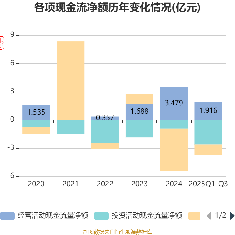 2025年前三季度,公司经营活动现金流净额为1.92亿元,同比增长3.55%;筹资活动现金流净额-1.16亿元,同比增加1.88亿元;投资活动现金流净额-2.61亿元,上年同期为-1.9亿元。
