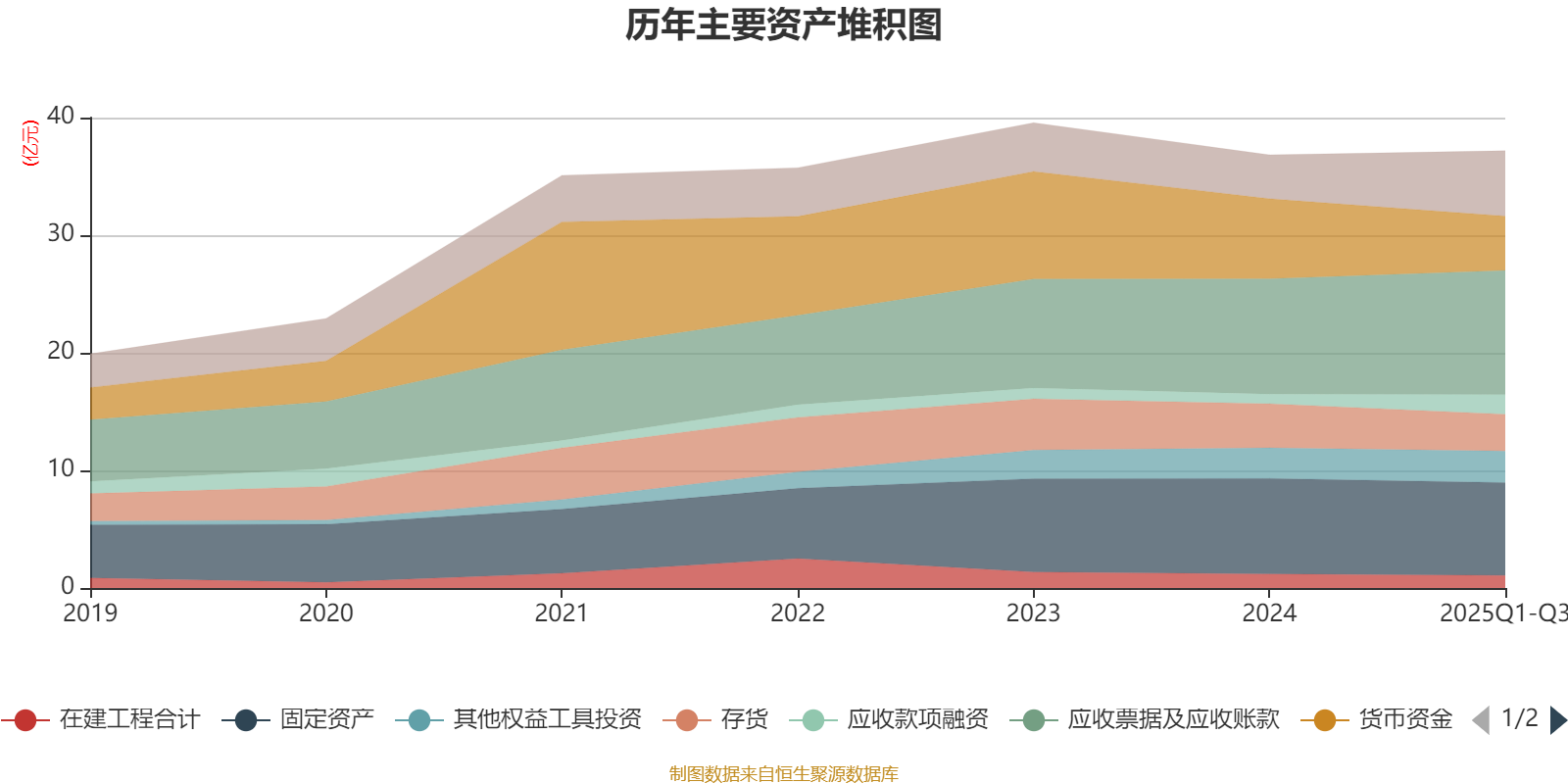 资产重大变化方面,截至2025年三季度末,公司货币资金较上年末减少32.17%,占公司总资产比重下降6.07个百分点;交易性金融资产合计占公司总资产的4.84%,上年末为0;应收款项融资较上年末增加103.57%,占公司总资产比重上升2.25个百分点;应收票据及应收账款较上年末增加7.75%,占公司总资产比重上升1.8个百分点。