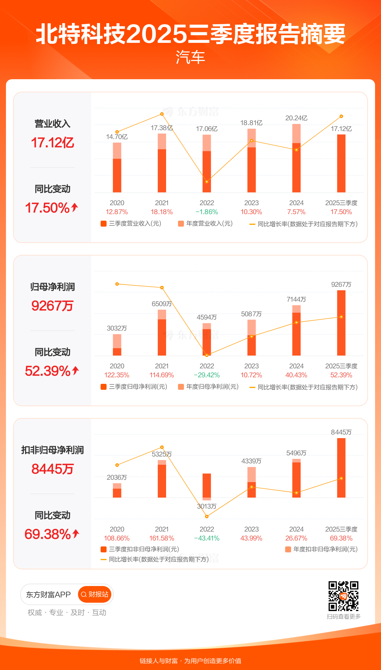 北特科技10月30日发布2025年三季报显示,公司前三季实现营业收入17.12亿元,同比增长17.50%;归母净利润9266.98万元,同比增长52.39%;扣非归母净利润8444.76万元,同比增长69.38%。