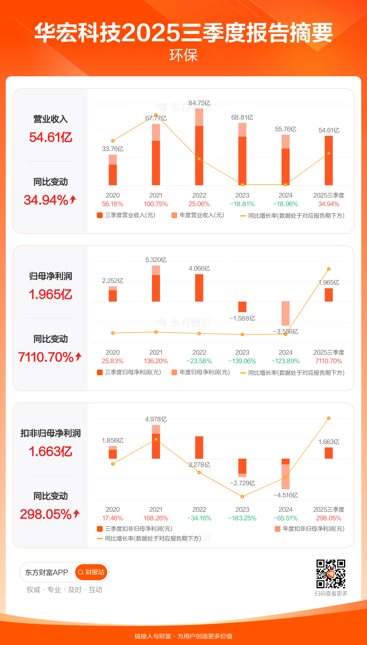 华宏科技10月30日发布2025年三季报显示,公司前三季实现营业收入54.61亿元,同比增长34.94%;归母净利润1.97亿元,同比增长7110.70%;扣非归母净利润1.66亿元,同比增长298.05%。
