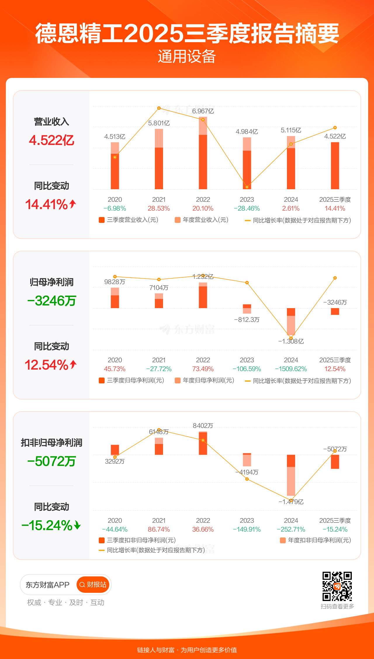 德恩精工10月30日发布2025年三季报显示,公司前三季实现营业收入4.52亿元,同比增长14.41%;归母净利润-3246.04万元;扣非归母净利润-5072.18万元。