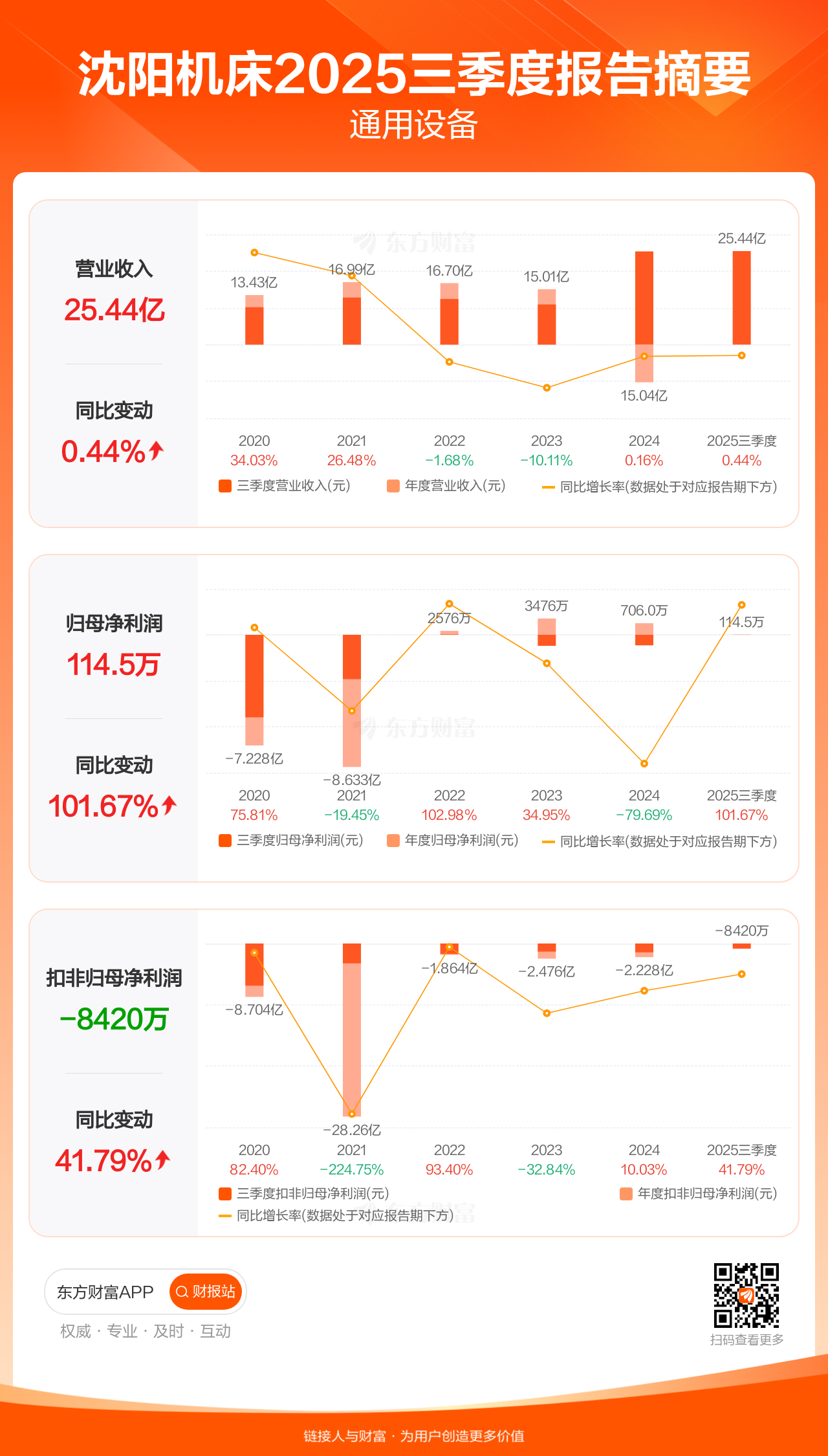 沈阳机床10月30日发布2025年三季报显示,公司前三季实现营业收入25.44亿元,同比增长0.44%;归母净利润114.54万元,同比增长101.67%;扣非归母净利润-8420.49万元。
