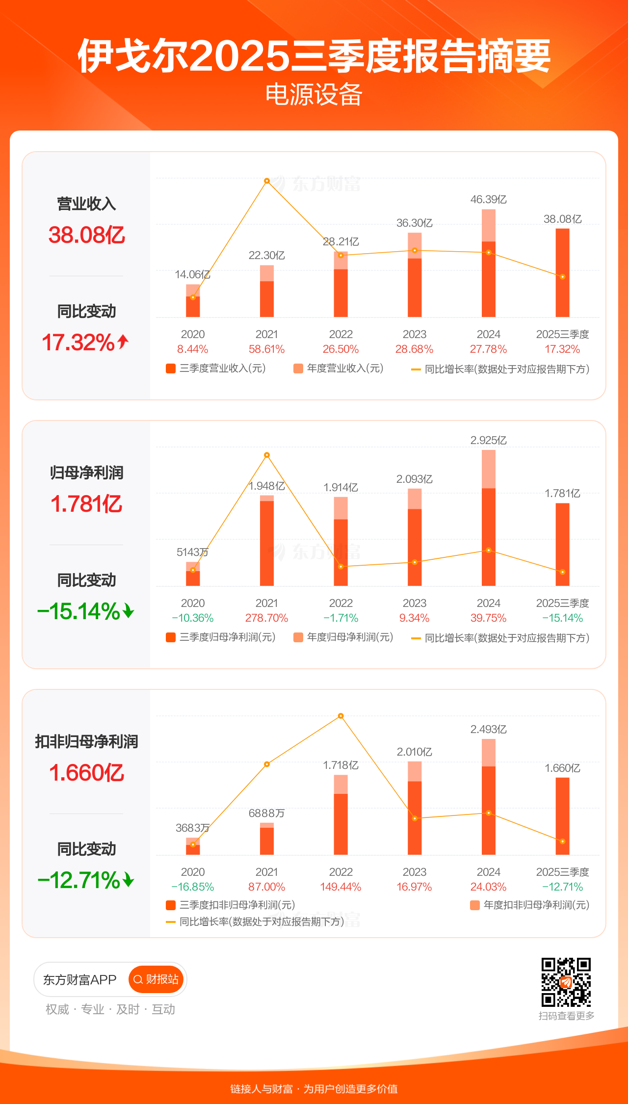 伊戈尔10月30日发布2025年三季报显示,公司前三季实现营业收入38.08亿元,同比增长17.32%;归母净利润1.78亿元,同比下滑15.14%;扣非归母净利润1.66亿元,同比下滑12.71%。
