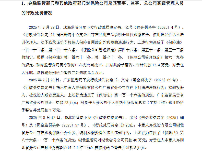 合规方面,今年7月28日,珠海监管分局对中意人寿珠海中心支公司作出行政处罚,因其利用产品说明会虚假宣传、使用误导性话术培训代理人及给予投保人合同外利益,责令改正并罚款17.4万元,同时对责任人徐鹏、洪伟聪分别给予警告并罚款2.2万元。同日,广东监管局对中意人寿广东省分公司罚款22万元,原因是其存在欺骗投保人、被保险人或受益人的行为,同时对责任人分公司个人营销业务部副总监(主持工作)张亚魁给予警告并罚款7万元。今年8月12日,湖北监管局对中意人寿湖北省分公司罚款40万元,因其虚构保险中介业务、编制虚假资料,同时对责任人湖北省分公司产融业务部副总监(主持工作)苏伟刚给予警告并罚款8万元。