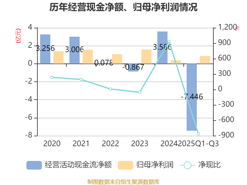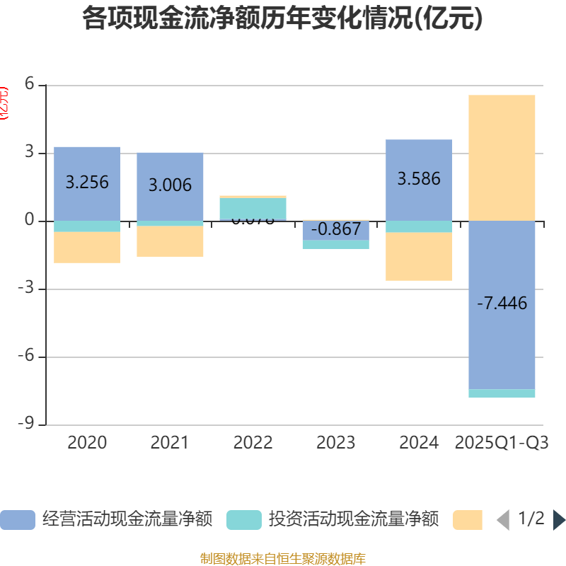 2025年前三季度,公司经营活动现金流净额为-7.45亿元,同比减少7.92亿元;筹资活动现金流净额5.55亿元,同比增加7.07亿元;投资活动现金流净额-3653.16万元,上年同期为-4502.89万元。