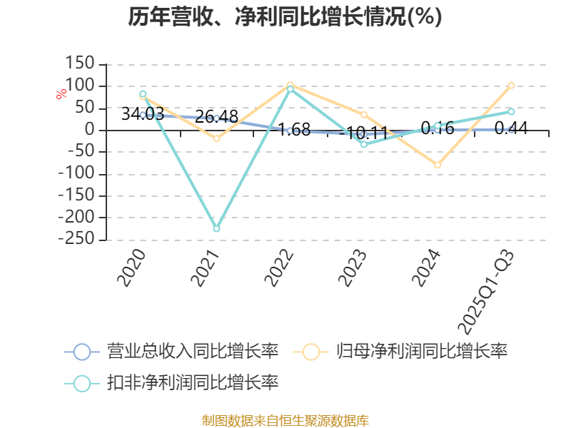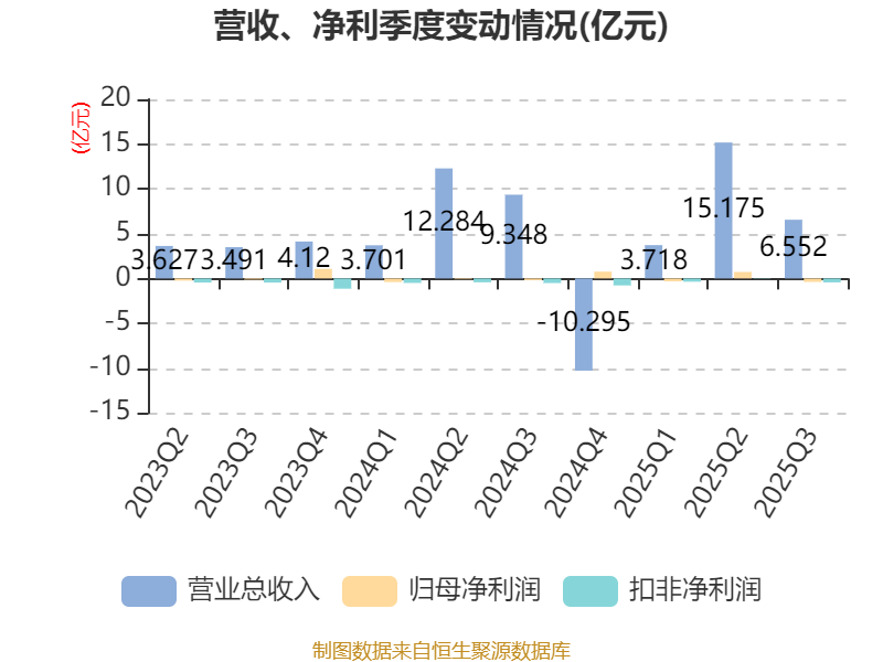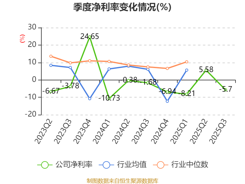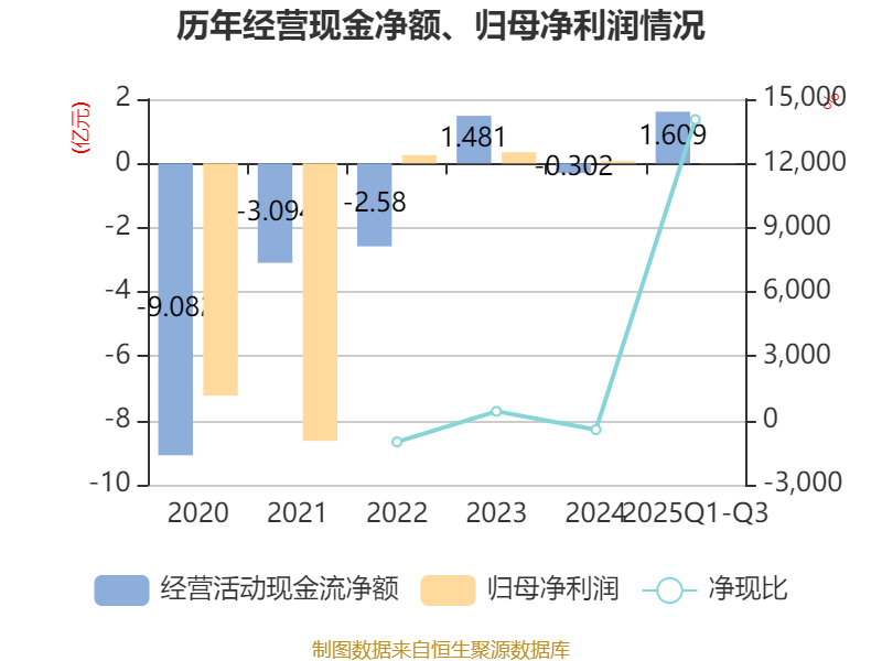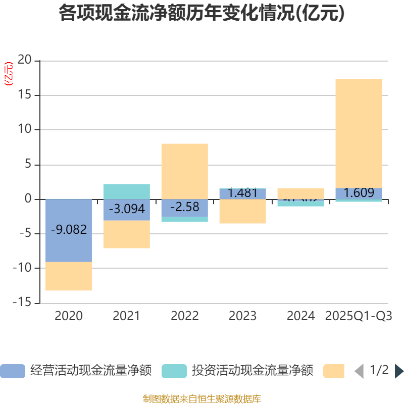 2025年前三季度,公司经营活动现金流净额为1.61亿元,同比增加3.67亿元;筹资活动现金流净额15.76亿元,同比增加14.36亿元;投资活动现金流净额-3821.33万元,上年同期为5079.32万元。