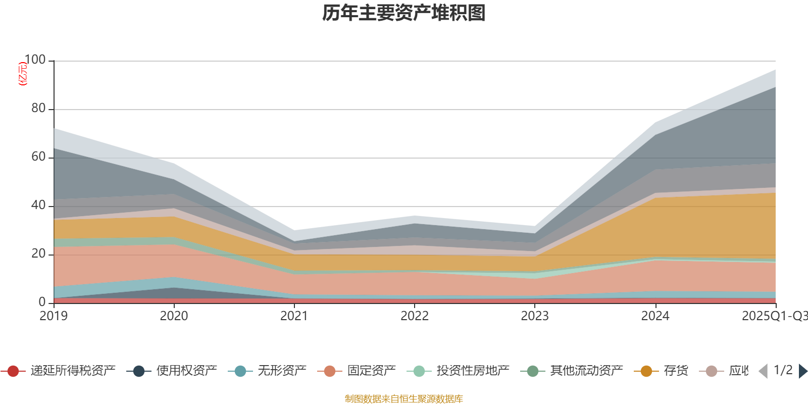 资产重大变化方面,截至2025年三季度末,公司货币资金较上年末增加120.35%,占公司总资产比重上升13.5个百分点;存货较上年末增加11.41%,占公司总资产比重下降4.54个百分点;固定资产较上年末减少5.19%,占公司总资产比重下降4.52个百分点;应收票据及应收账款较上年末增加2.65%,占公司总资产比重下降2.67个百分点。