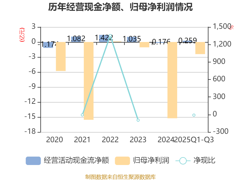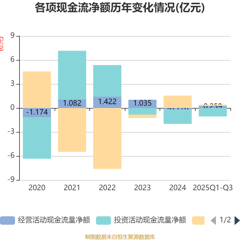 2025年前三季度,公司经营活动现金流净额为2587.37万元,同比增加9313.63万元;筹资活动现金流净额1670.55万元,同比减少3495.74万元;投资活动现金流净额-1.05亿元,上年同期为-8771.84万元。