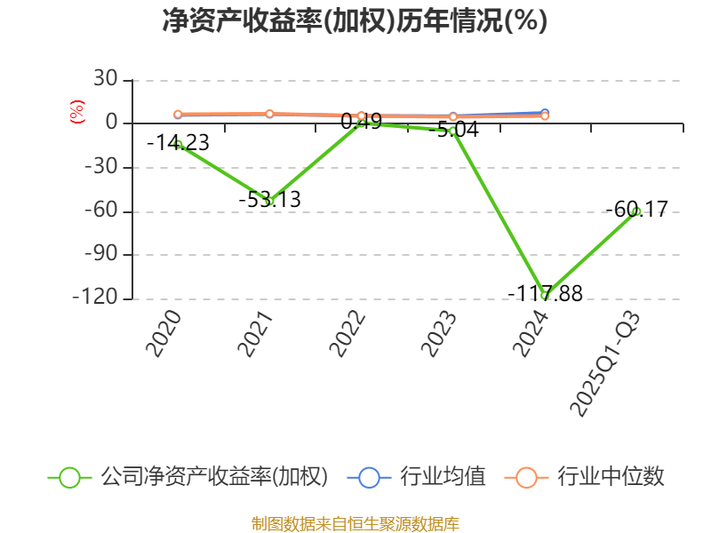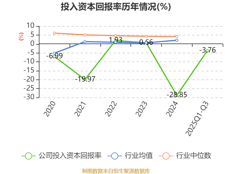 盈利能力方面, 2025年前三季度公司加权平均净资产收益率为-60.17%,同比下降44.75个百分点。公司2025年前三季度投入资本回报率为-3.76%,较上年同期下降0.32个百分点。