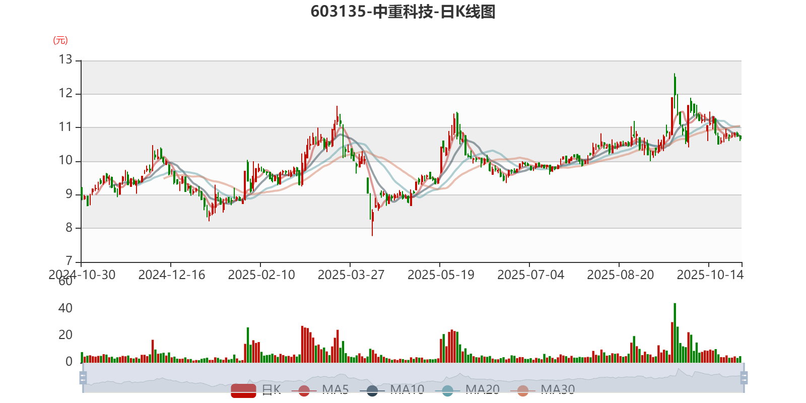 中证智能财讯中重科技(603135)10月30日披露2025年第三季度报告。前三季度公司实现营业总收入3.01亿元,同比下降47.83%;归母净利润亏损315.31万元,上年同期盈利684.09万元;扣非净利润亏损1820.36万元,上年同期亏损1086.83万元;经营活动产生的现金流量净额为2.18亿元,上年同期为-4805.01万元;报告期内,中重科技基本每股收益为-0.01元,加权平均净资产收益率为-0.11%。