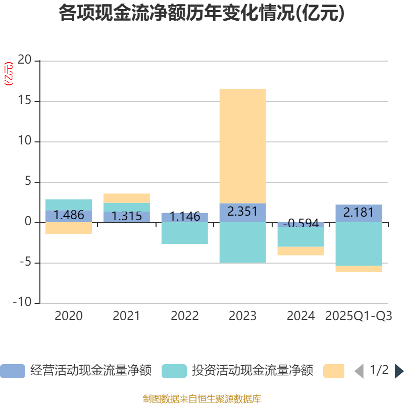 2025年前三季度,公司经营活动现金流净额为2.18亿元,同比增加2.66亿元;筹资活动现金流净额-7637.42万元,同比增加3401.24万元;投资活动现金流净额-5.39亿元,上年同期为-8.26亿元。