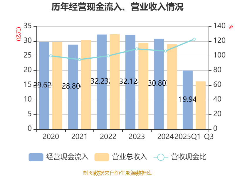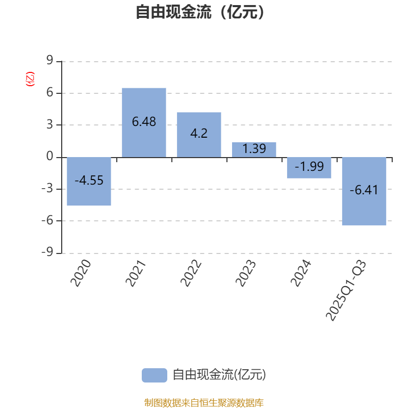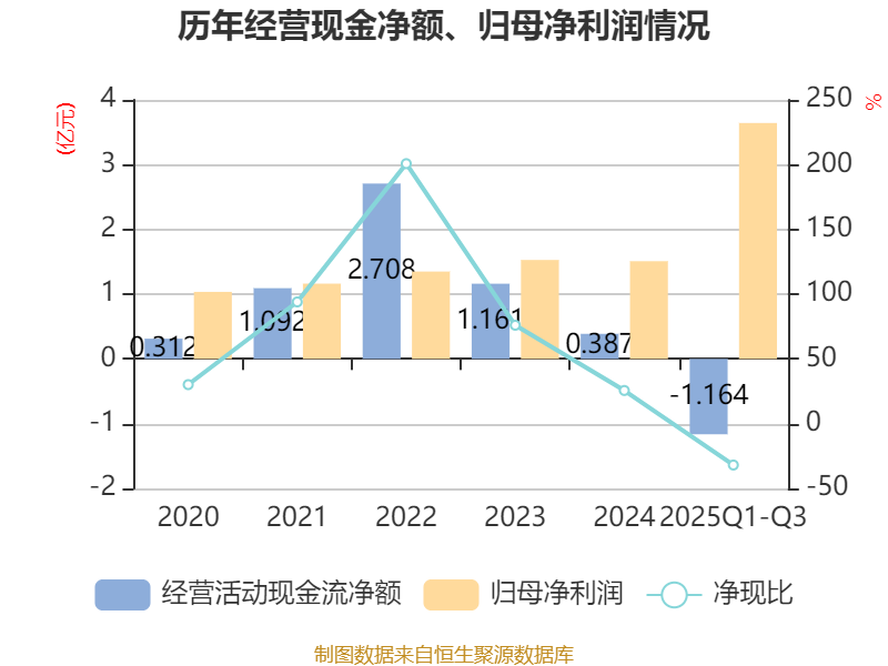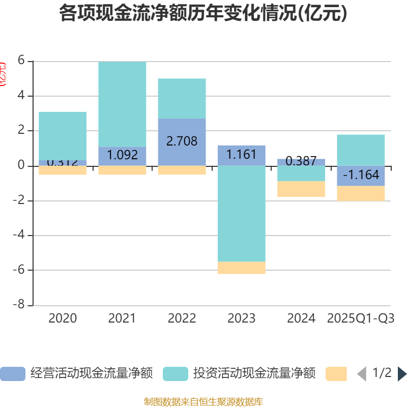 2025年前三季度,公司经营活动现金流净额为-1.16亿元,同比增加5970.76万元;筹资活动现金流净额-8605.31万元,同比减少726.62万元;投资活动现金流净额1.78亿元,上年同期为-7345.61万元。