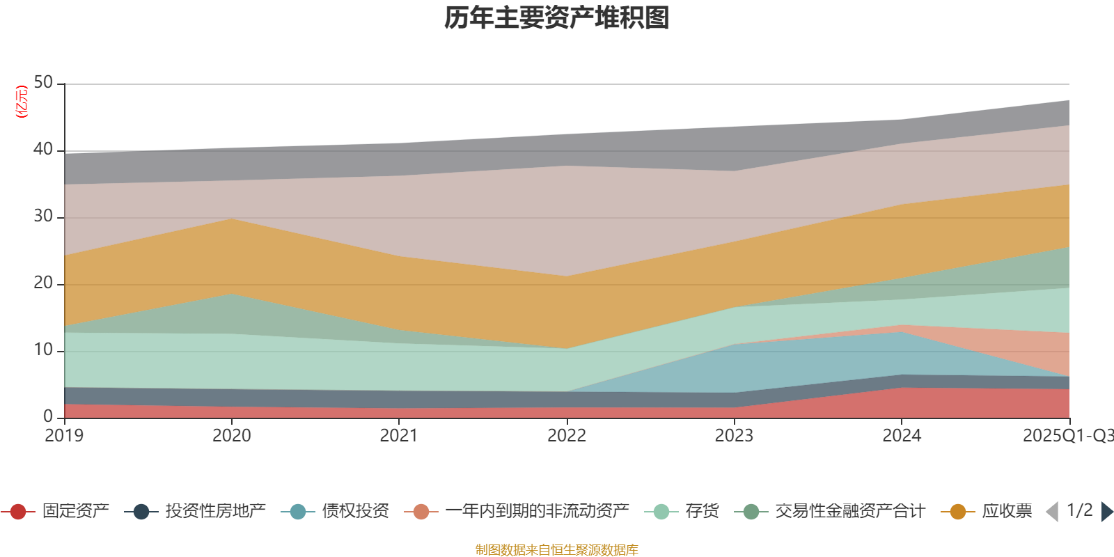 资产重大变化方面,截至2025年三季度末,公司债权投资较上年末减少100%,占公司总资产比重下降14.29个百分点;一年内到期的非流动资产较上年末增加501.2%,占公司总资产比重上升11.3个百分点;存货较上年末增加78.34%,占公司总资产比重上升5.71个百分点;交易性金融资产合计较上年末增加90.11%,占公司总资产比重上升5.65个百分点。