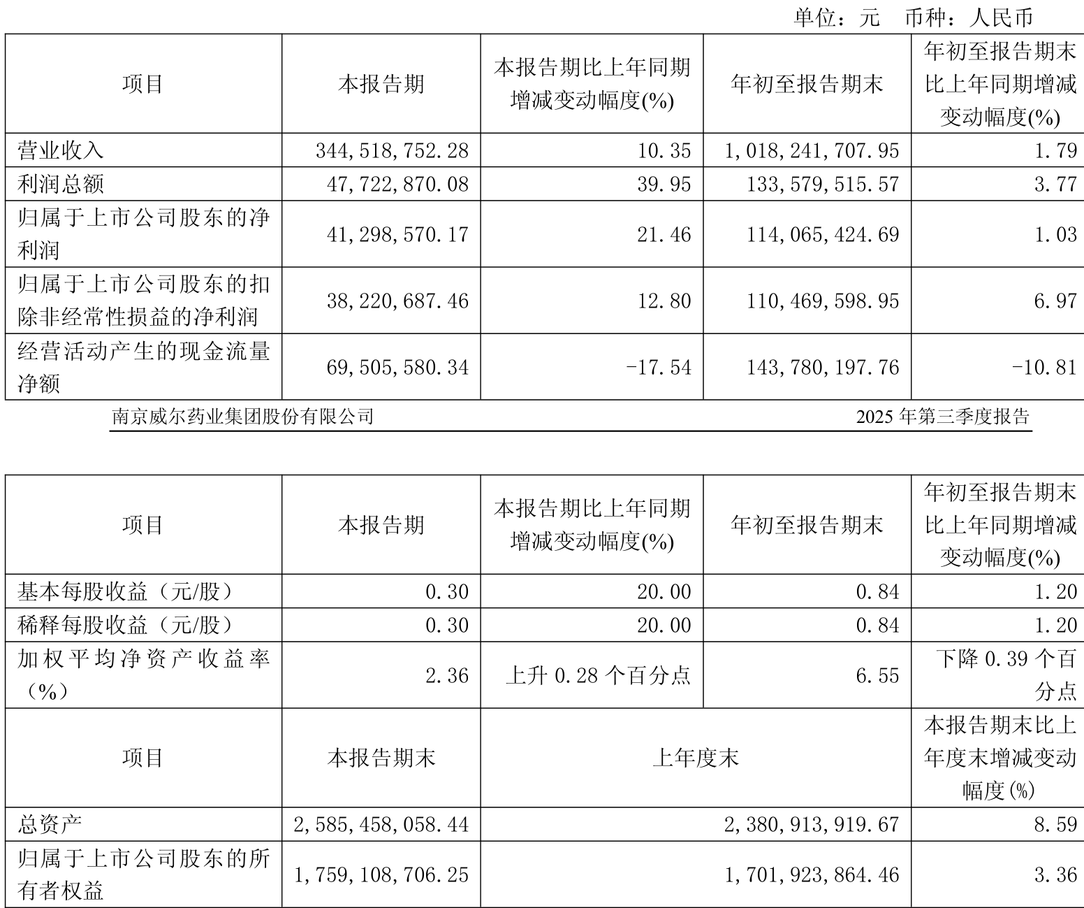 中证智能财讯威尔药业(603351)10月30日披露2025年第三季度报告。前三季度公司实现营业总收入10.18亿元,同比增长1.79%;归母净利润1.14亿元,同比增长1.03%;扣非净利润1.1亿元,同比增长6.97%;经营活动产生的现金流量净额为1.44亿元,同比下降10.81%;报告期内,威尔药业基本每股收益为0.84元,加权平均净资产收益率为6.55%。