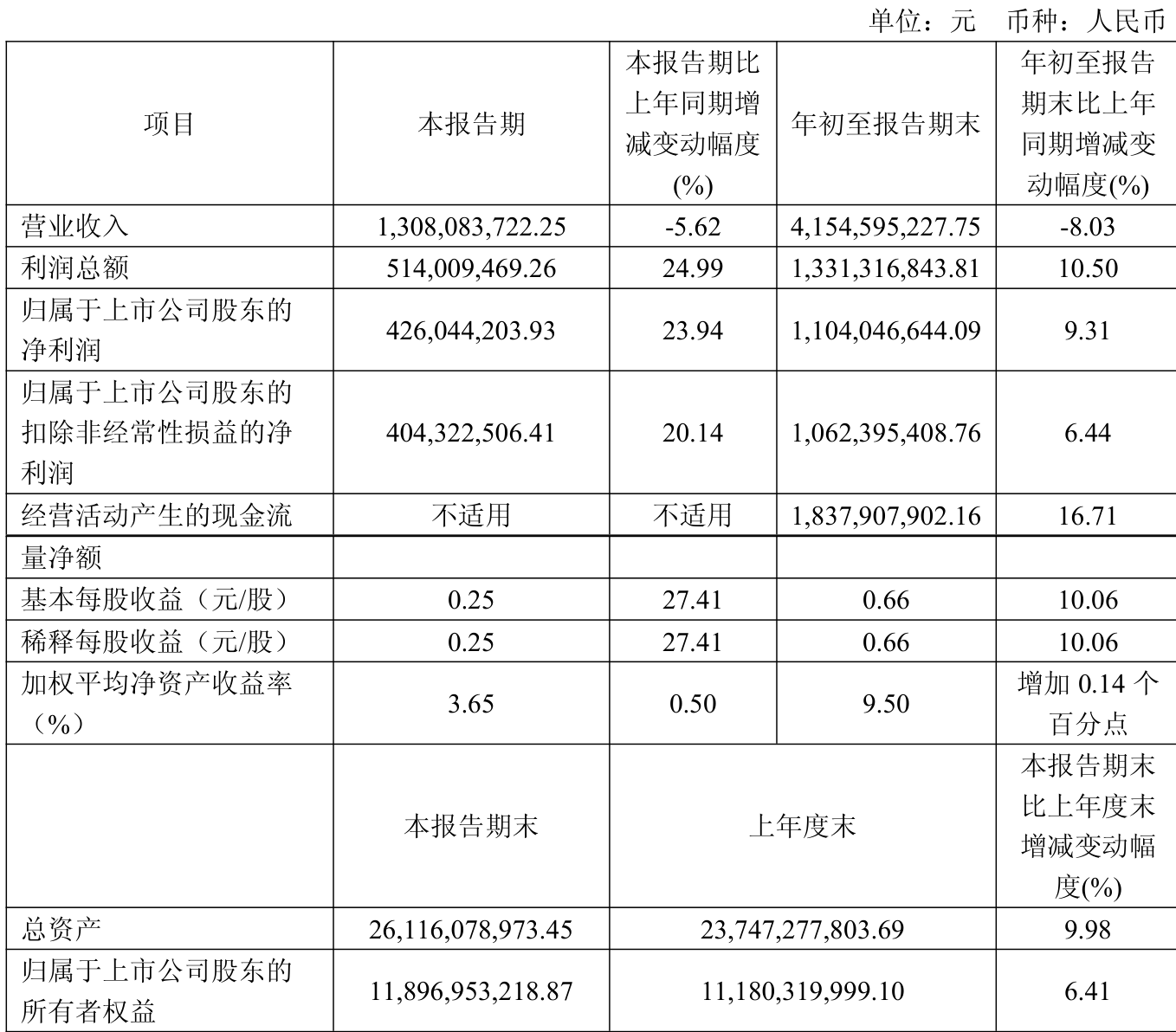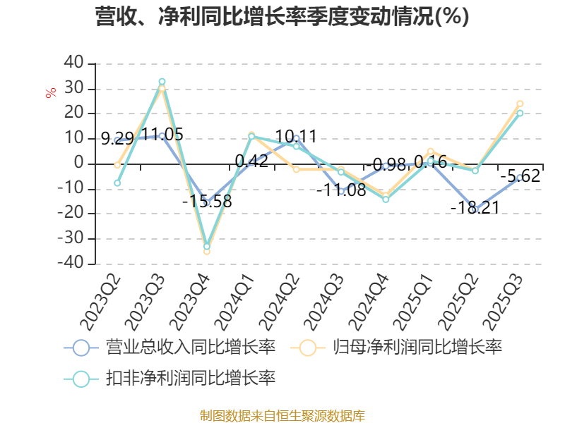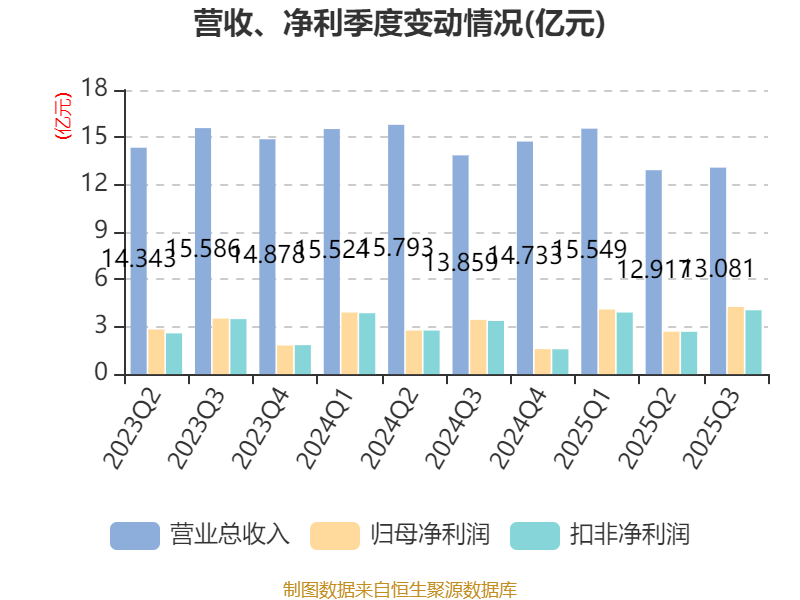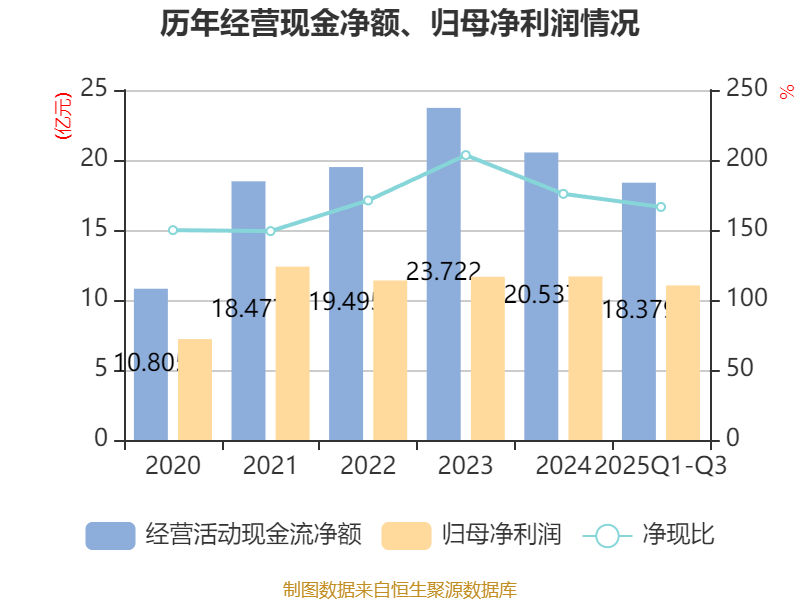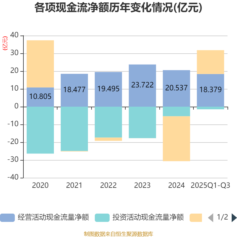 2025年前三季度,公司经营活动现金流净额为18.38亿元,同比增长16.71%;筹资活动现金流净额13.4亿元,同比增加31.17亿元;投资活动现金流净额-1.5亿元,上年同期为-8.46亿元。