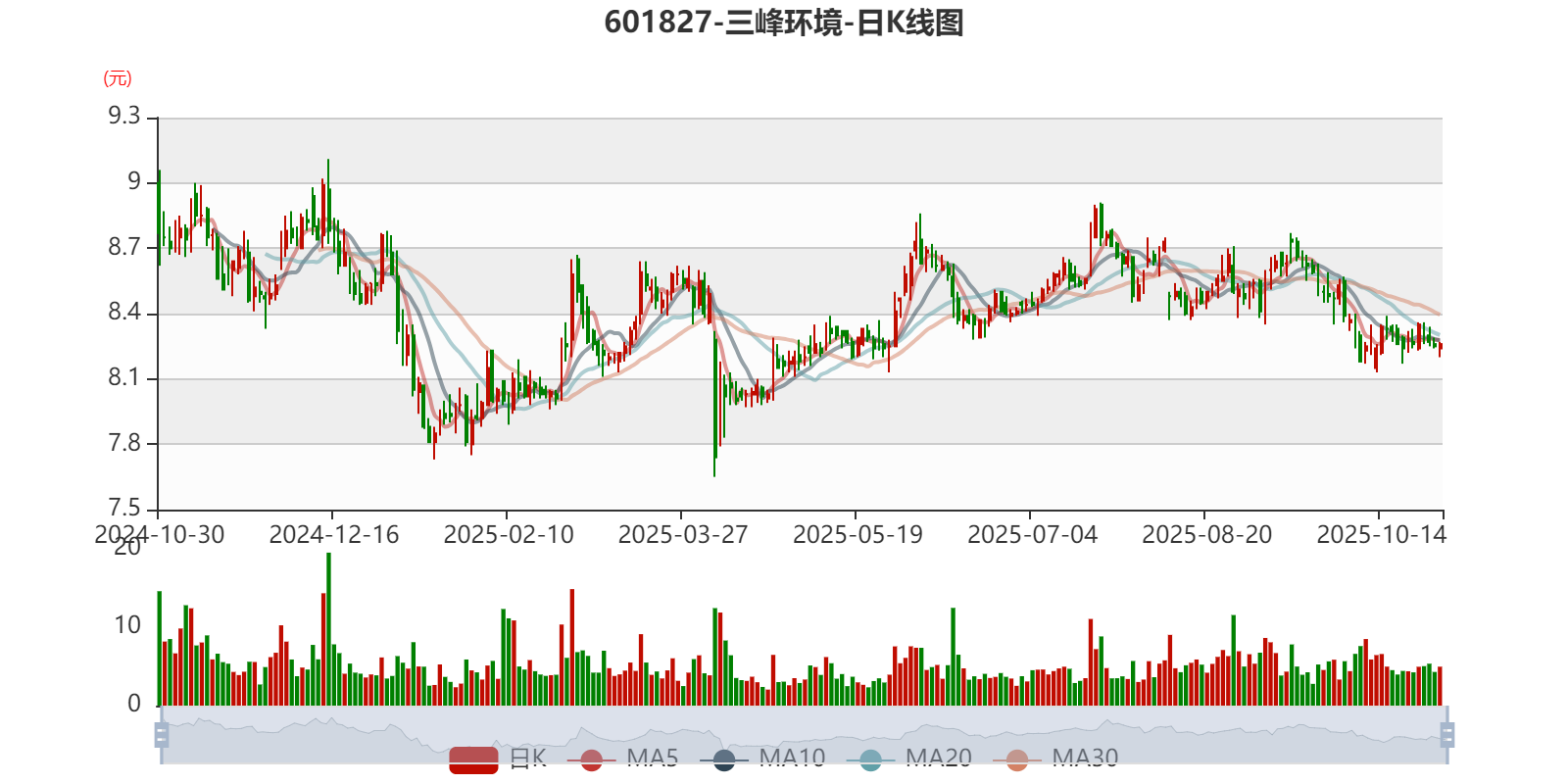 中证智能财讯三峰环境(601827)10月30日披露2025年第三季度报告。前三季度公司实现营业总收入41.55亿元,同比下降8.03%;归母净利润11.04亿元,同比增长9.31%;扣非净利润10.62亿元,同比增长6.44%;经营活动产生的现金流量净额为18.38亿元,同比增长16.71%;报告期内,三峰环境基本每股收益为0.66元,加权平均净资产收益率为9.50%。