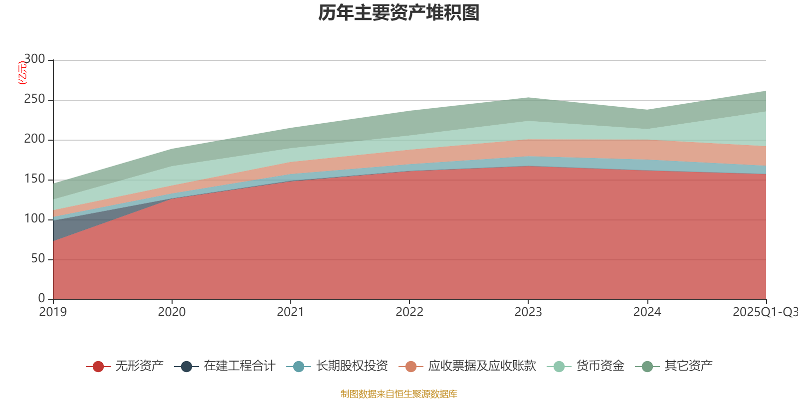资产重大变化方面,截至2025年三季度末,公司货币资金较上年末增加226.48%,占公司总资产比重上升11.04个百分点;无形资产较上年末减少2.77%,占公司总资产比重下降7.86个百分点;长期股权投资较上年末减少22.64%,占公司总资产比重下降1.69个百分点;应收票据及应收账款较上年末减少2.22%,占公司总资产比重下降1.17个百分点。