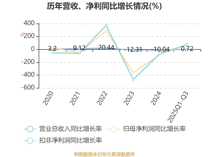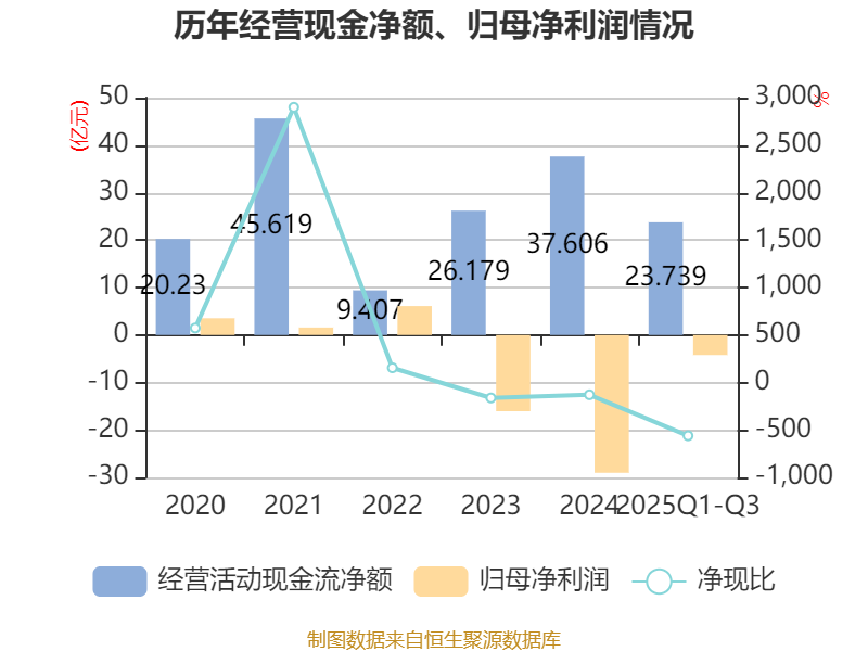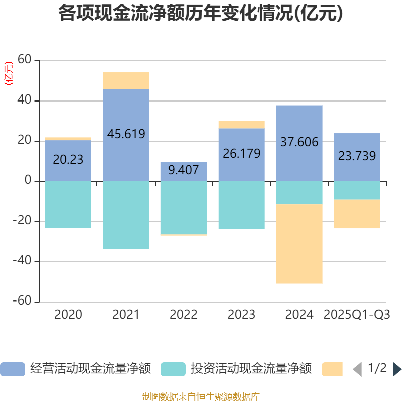 2025年前三季度,公司经营活动现金流净额为23.74亿元,同比下降17.06%;筹资活动现金流净额-14.08亿元,同比增加12.95亿元;投资活动现金流净额-9.42亿元,上年同期为-8.66亿元。