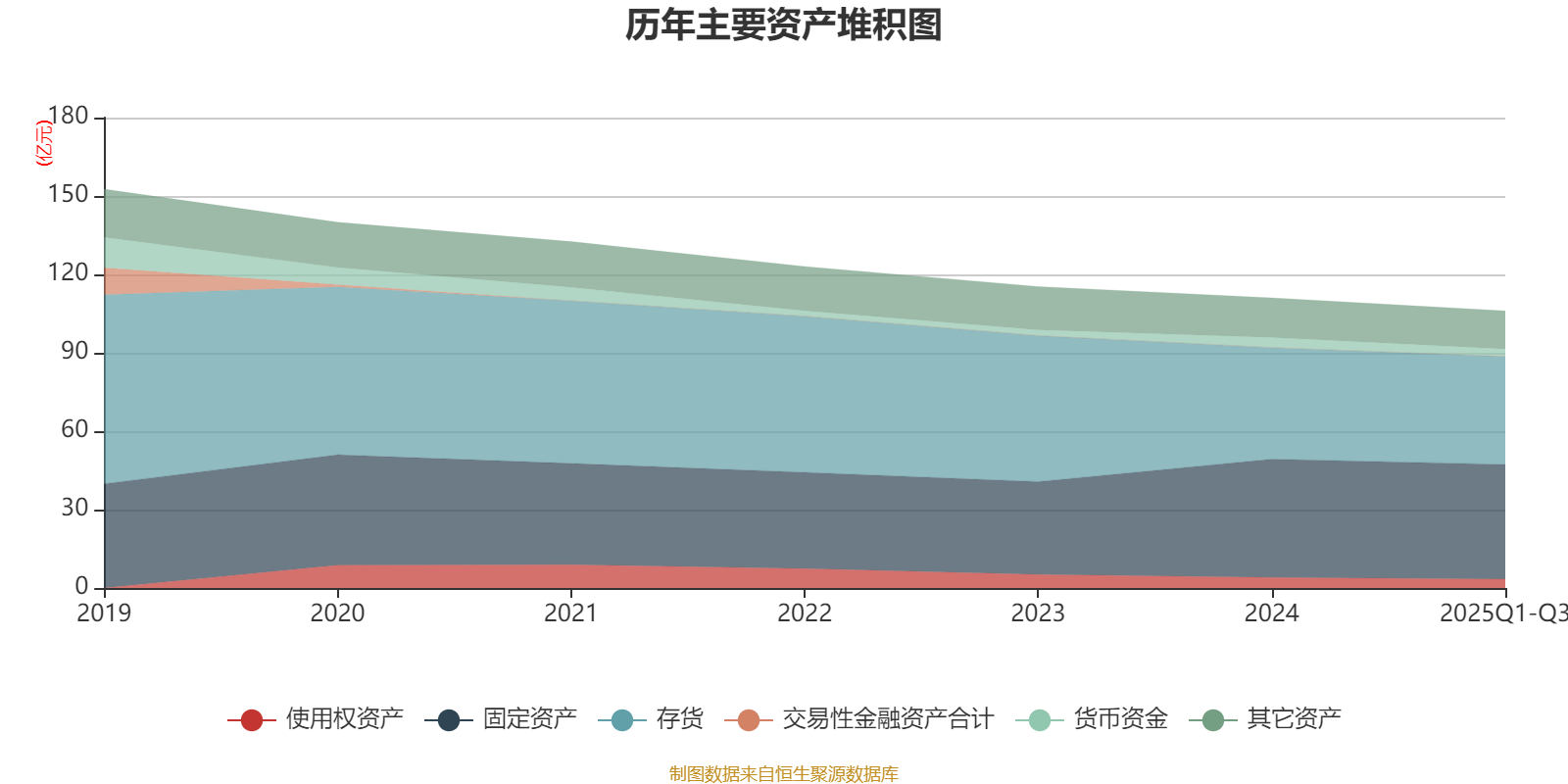 资产重大变化方面,截至2025年三季度末,公司货币资金较上年末减少26.89%,占公司总资产比重下降0.81个百分点;固定资产较上年末减少3.18%,占公司总资产比重上升0.56个百分点;存货较上年末减少3.25%,占公司总资产比重上升0.5个百分点;使用权资产较上年末减少14.95%,占公司总资产比重下降0.39个百分点。