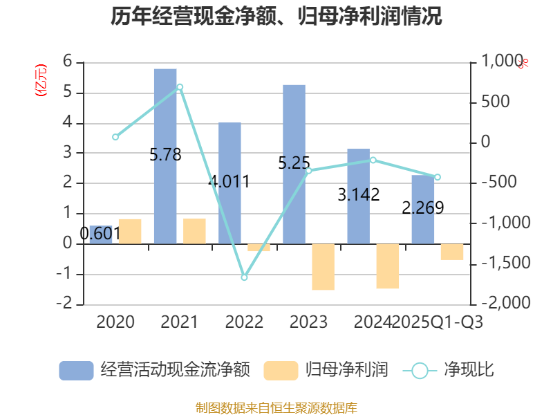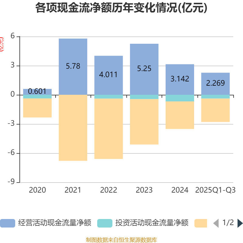 2025年前三季度,公司经营活动现金流净额为2.27亿元,同比增长93.35%;筹资活动现金流净额-2.41亿元,同比减少5388.9万元;投资活动现金流净额-3923.68万元,上年同期为-906.72万元。