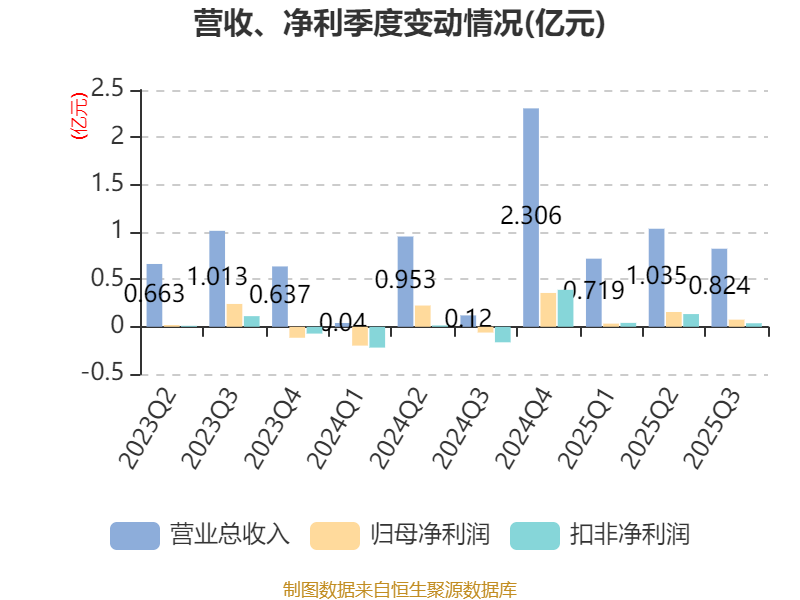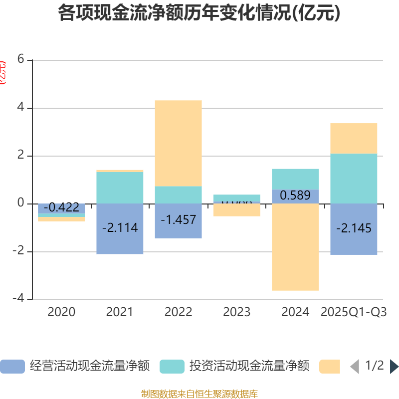 2025年前三季度,公司经营活动现金流净额为-2.15亿元,同比减少6473.4万元;筹资活动现金流净额1.27亿元,同比增加1.67亿元;投资活动现金流净额2.09亿元,上年同期为6913.42万元。