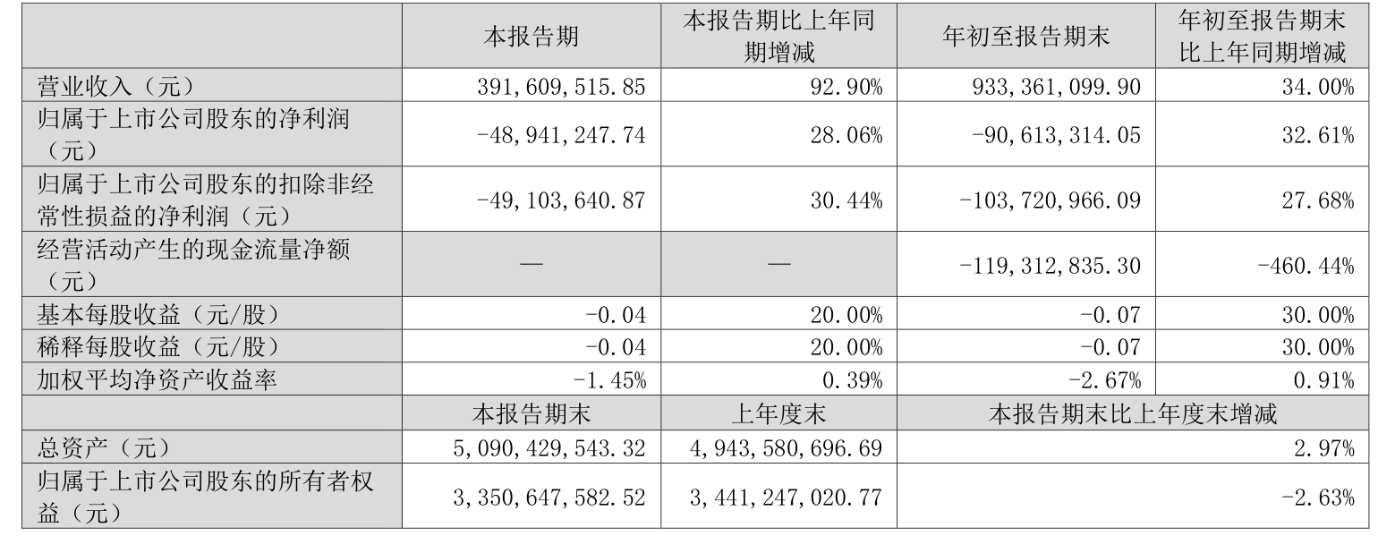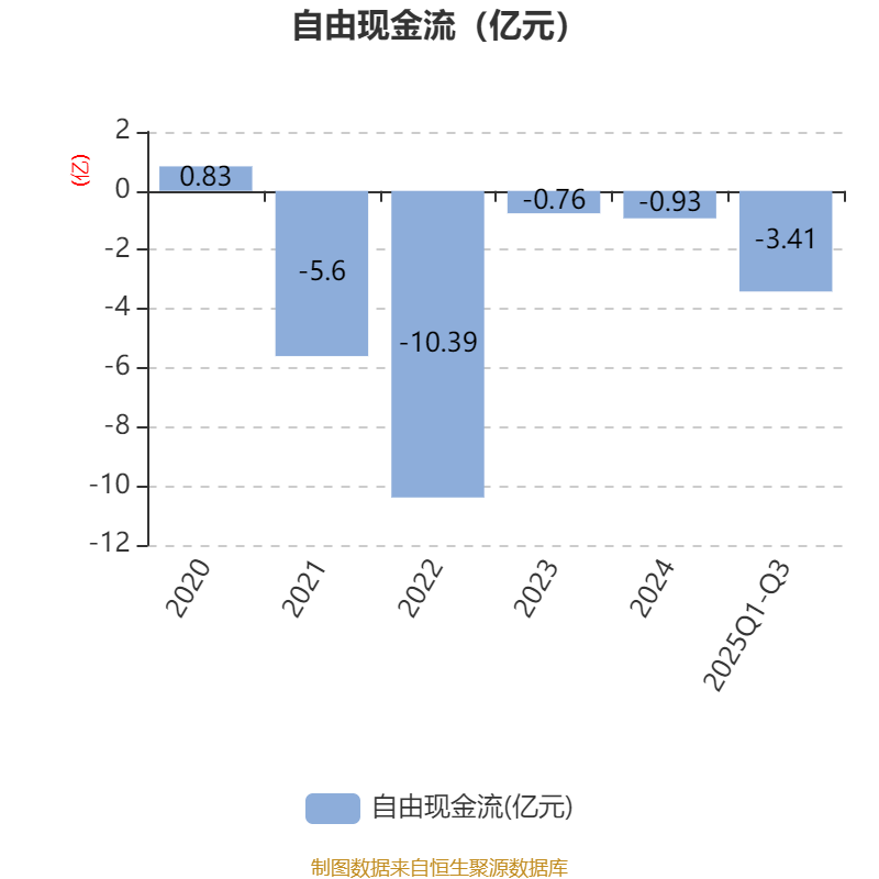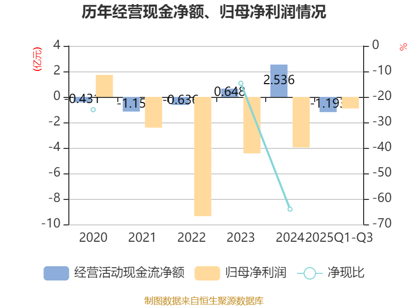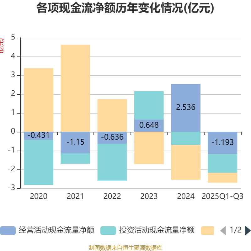 2025年前三季度,公司经营活动现金流净额为-1.19亿元,同比减少9802.36万元;筹资活动现金流净额-5240.93万元,同比增加1.52亿元;投资活动现金流净额-9869.8万元,上年同期为-1.58亿元。