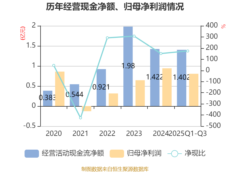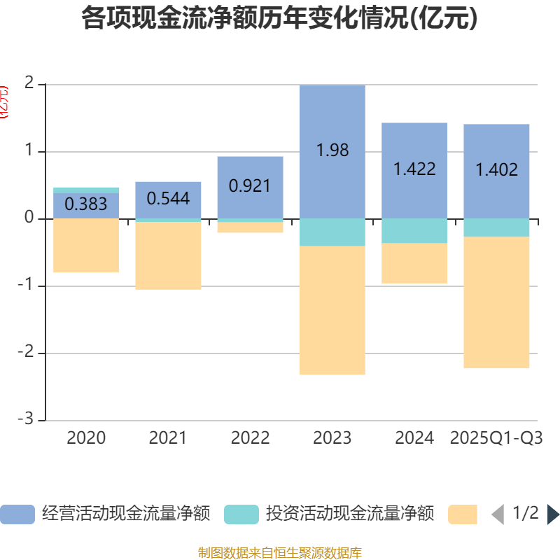 2025年前三季度,公司经营活动现金流净额为1.4亿元,同比增长257.36%;筹资活动现金流净额-1.95亿元,同比减少1.32亿元;投资活动现金流净额-2762.54万元,上年同期为-2655.38万元。