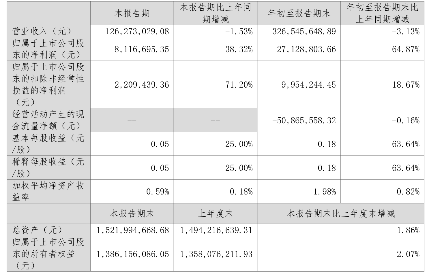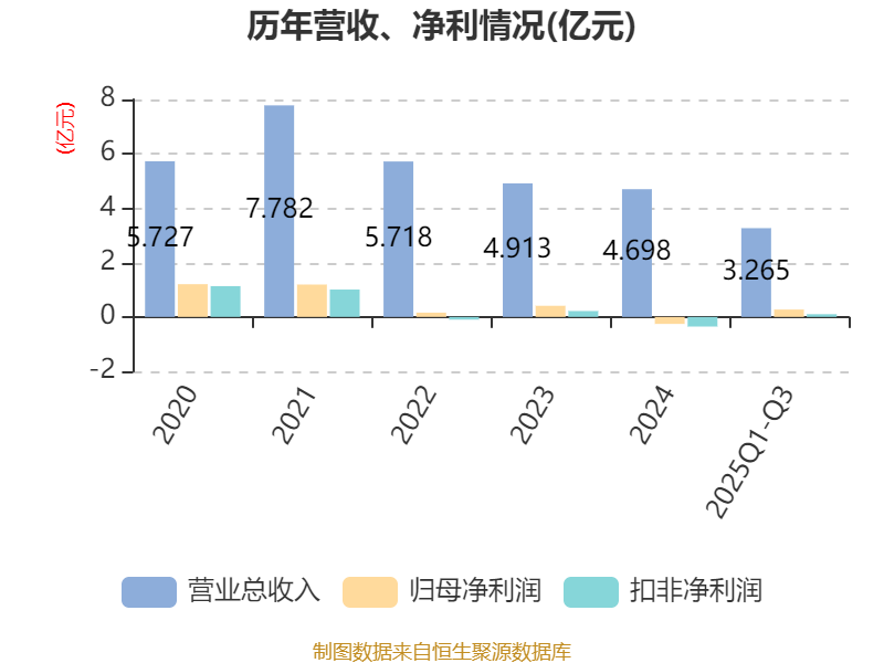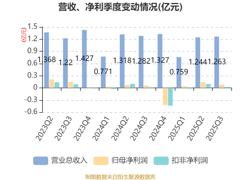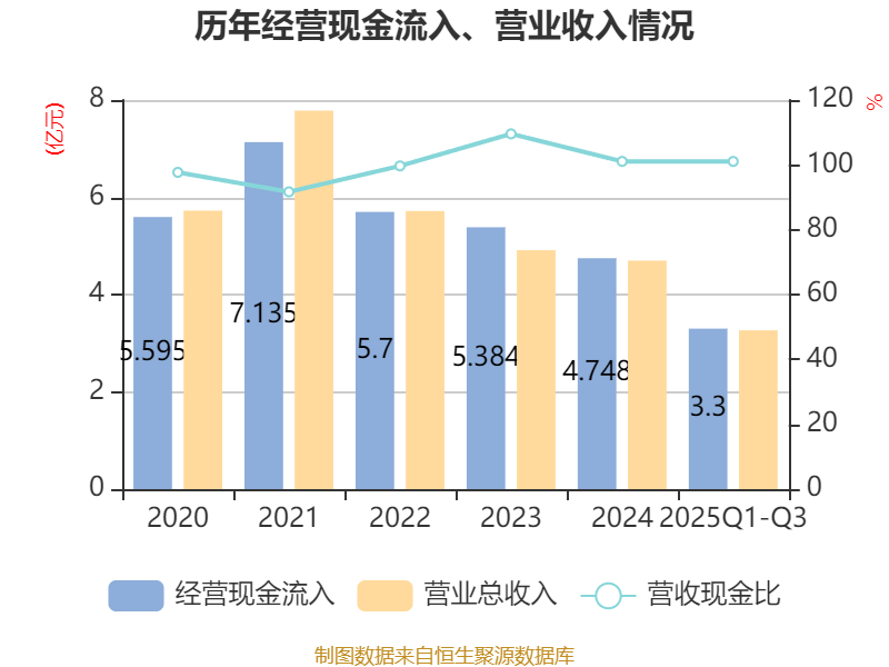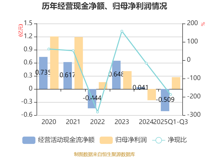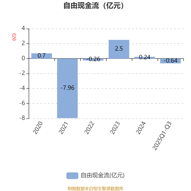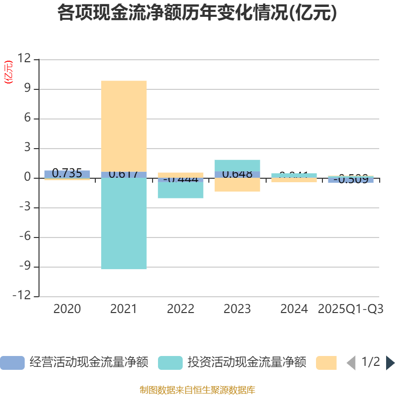 2025年前三季度,公司经营活动现金流净额为-5086.56万元,同比减少8.03万元;筹资活动现金流净额520.3万元,同比减少113.54万元;投资活动现金流净额1660.04万元,上年同期为2952.49万元。
