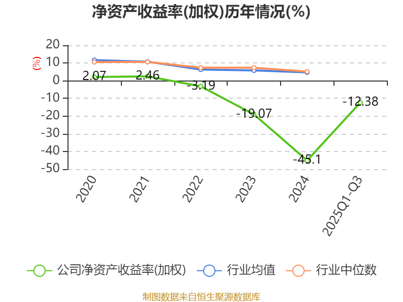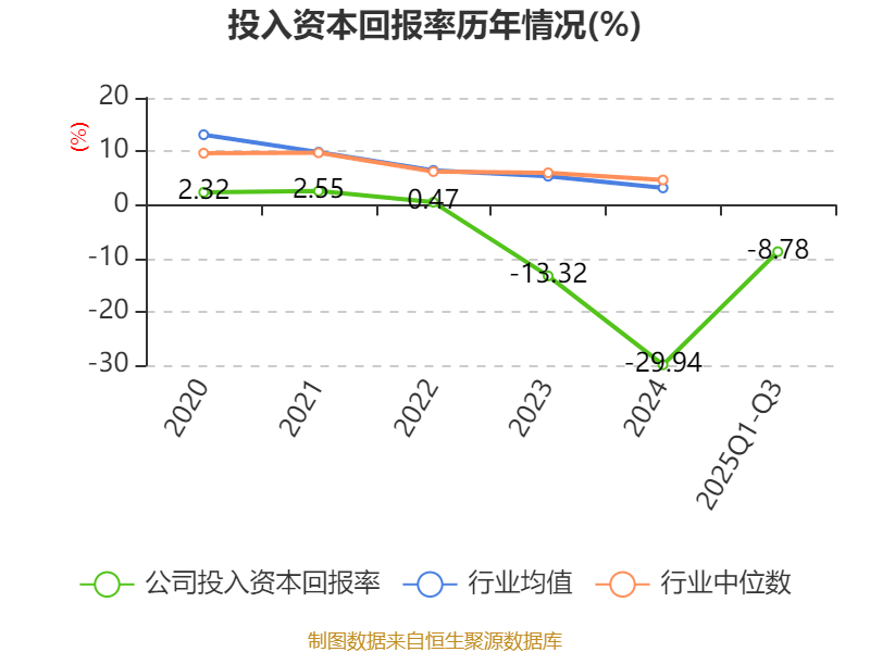 盈利能力方面, 2025年前三季度公司加权平均净资产收益率为-12.38%,同比下降2.4个百分点。公司2025年前三季度投入资本回报率为-8.78%,较上年同期下降3.28个百分点。