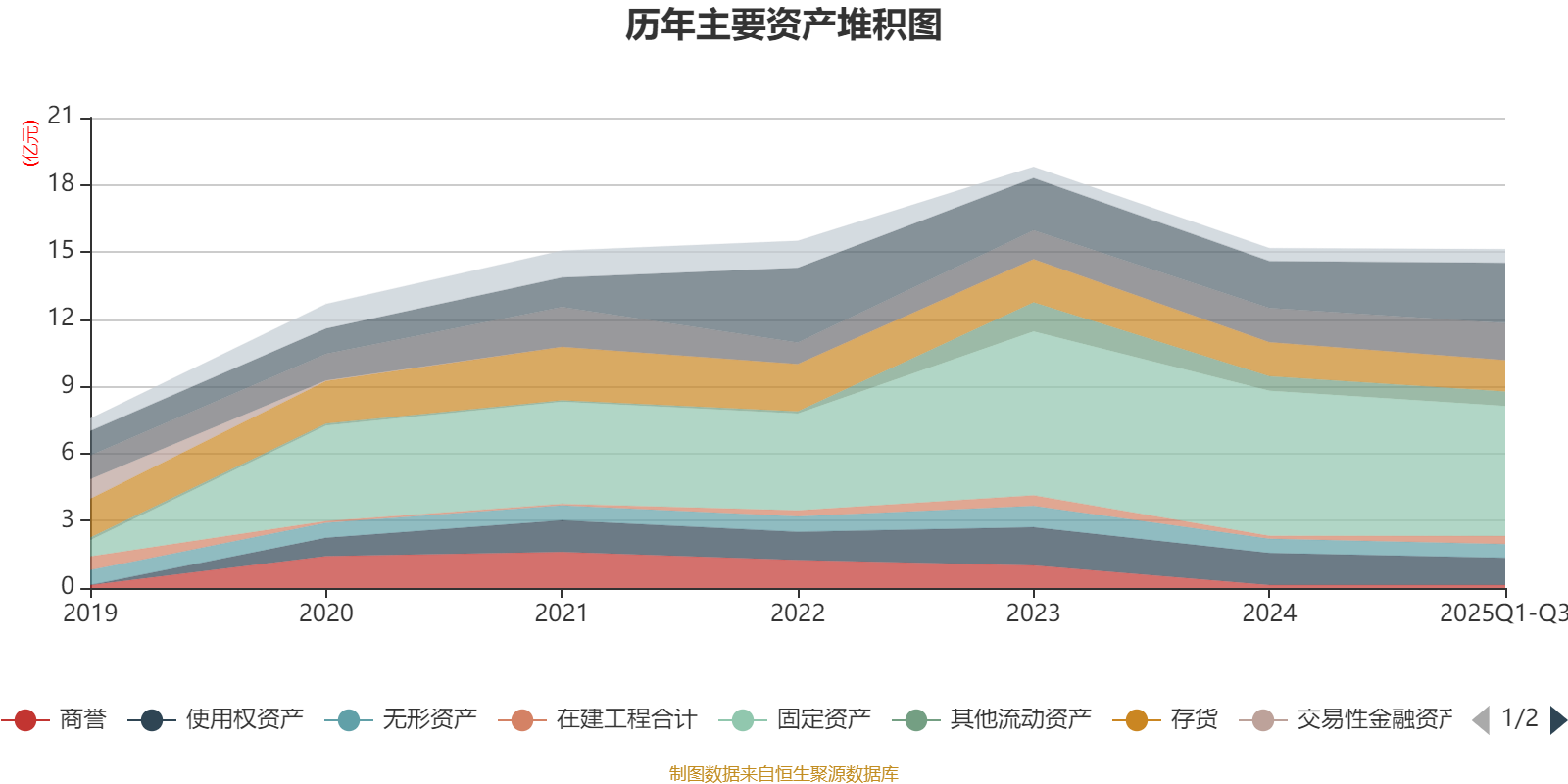 资产重大变化方面,截至2025年三季度末,公司固定资产较上年末减少10.3%,占公司总资产比重下降4.28个百分点;货币资金较上年末增加28.84%,占公司总资产比重上升4.03个百分点;在建工程合计较上年末增加170.71%,占公司总资产比重上升1.49个百分点;使用权资产较上年末减少14.74%,占公司总资产比重下降1.36个百分点。
