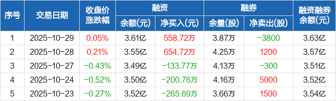 融资方面,当日融资买入2804.19万元,融资偿还2245.47万元,融资净买入558.72万元。融券方面,融券卖出3400股,融券偿还7200股,融券余量3.87万股,融券余额169.26万元。融资融券余额合计3.63亿元。