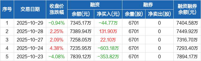 融资方面,当日融资买入474.85万元,融资偿还519.62万元,融资净偿还44.77万元。融券方面,融券卖出0股,融券偿还0股,融券余量6701股,融券余额59.41万元。融资融券余额合计7404.58万元。