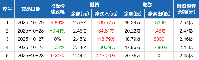 融资方面,当日融资买入2559.06万元,融资偿还1823.33万元,融资净买入735.72万元,连续3日净买入累计939.33万元。融券方面,融券卖出3000股,融券偿还1.13万股,融券余量19.39万股,融券余额99.86万元。融资融券余额合计2.54亿元。